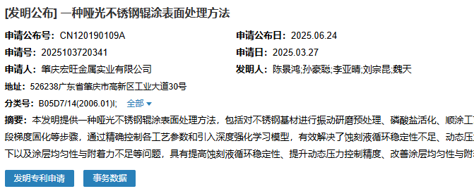 2025年6月24日,肇慶宏旺金屬實業(yè)有限公司成功申請一項名為“一種啞光不銹鋼輥涂表面處理方法”專利,申請公布號為CN120190109A,申請日期為2025年3月27日。