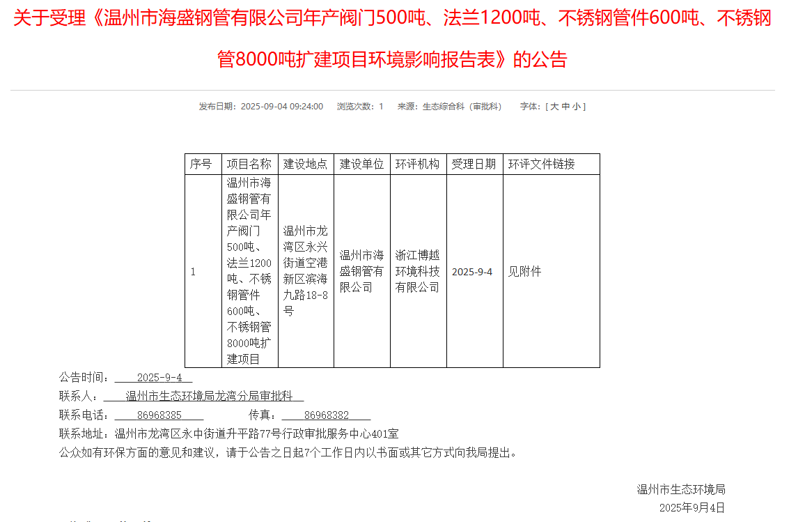 2025年9月4日,溫州市生態(tài)環(huán)境局受理溫州市海盛鋼管有限公司年產(chǎn)閥門(mén)500噸、法蘭1200噸、不銹鋼管件600噸、不銹鋼管8000噸擴(kuò)建項(xiàng)目環(huán)境影響報(bào)告表并對(duì)外進(jìn)行公告,公告期:7個(gè)工作日。