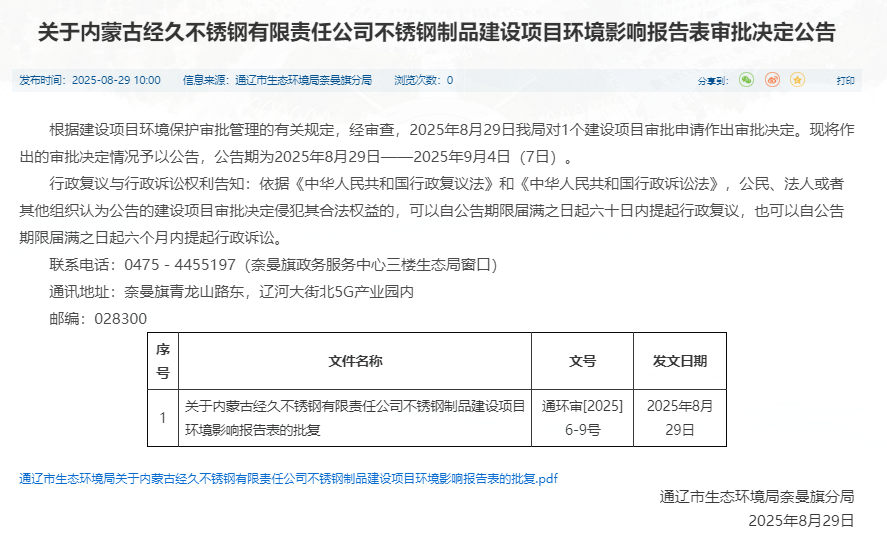 8月29日,通遼市生態(tài)環(huán)境局奈曼旗分局分布了《關(guān)于內(nèi)蒙古經(jīng)久不銹鋼有限責(zé)任公司不銹鋼制品建設(shè)項(xiàng)目環(huán)境影響報(bào)告表審批決定公告》。