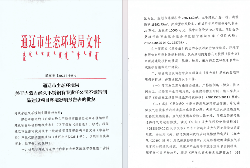 內(nèi)蒙古經(jīng)久不銹鋼有限責(zé)任公司不銹鋼制品建設(shè)項(xiàng)目正式通過(guò)審批