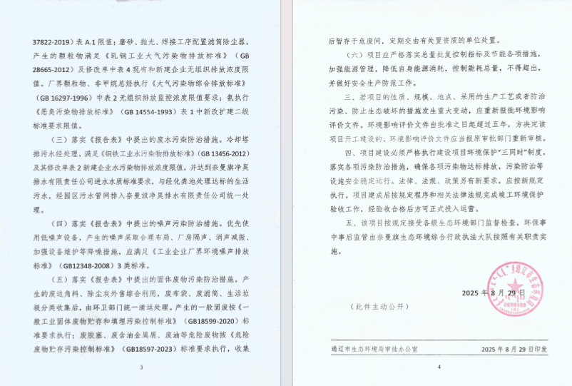 根據(jù)附件文件顯示:原則同意內(nèi)蒙古經(jīng)久不銹鋼有限責(zé)任公司按照《報(bào)告表》中所列建設(shè)項(xiàng)目的性質(zhì)、規(guī)模、地點(diǎn)、采用的工藝和擬采取的環(huán)境保護(hù)措施等進(jìn)行建設(shè)。